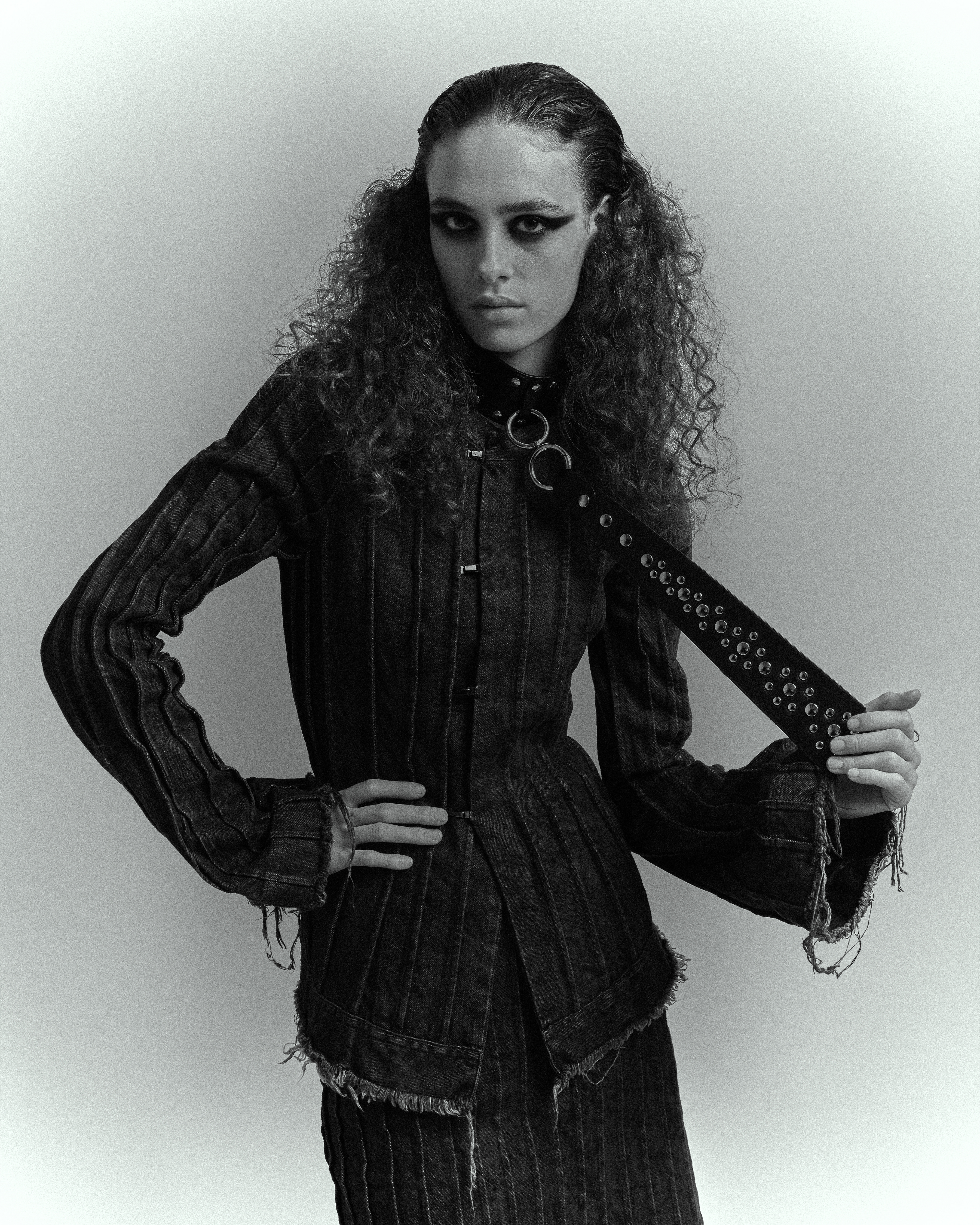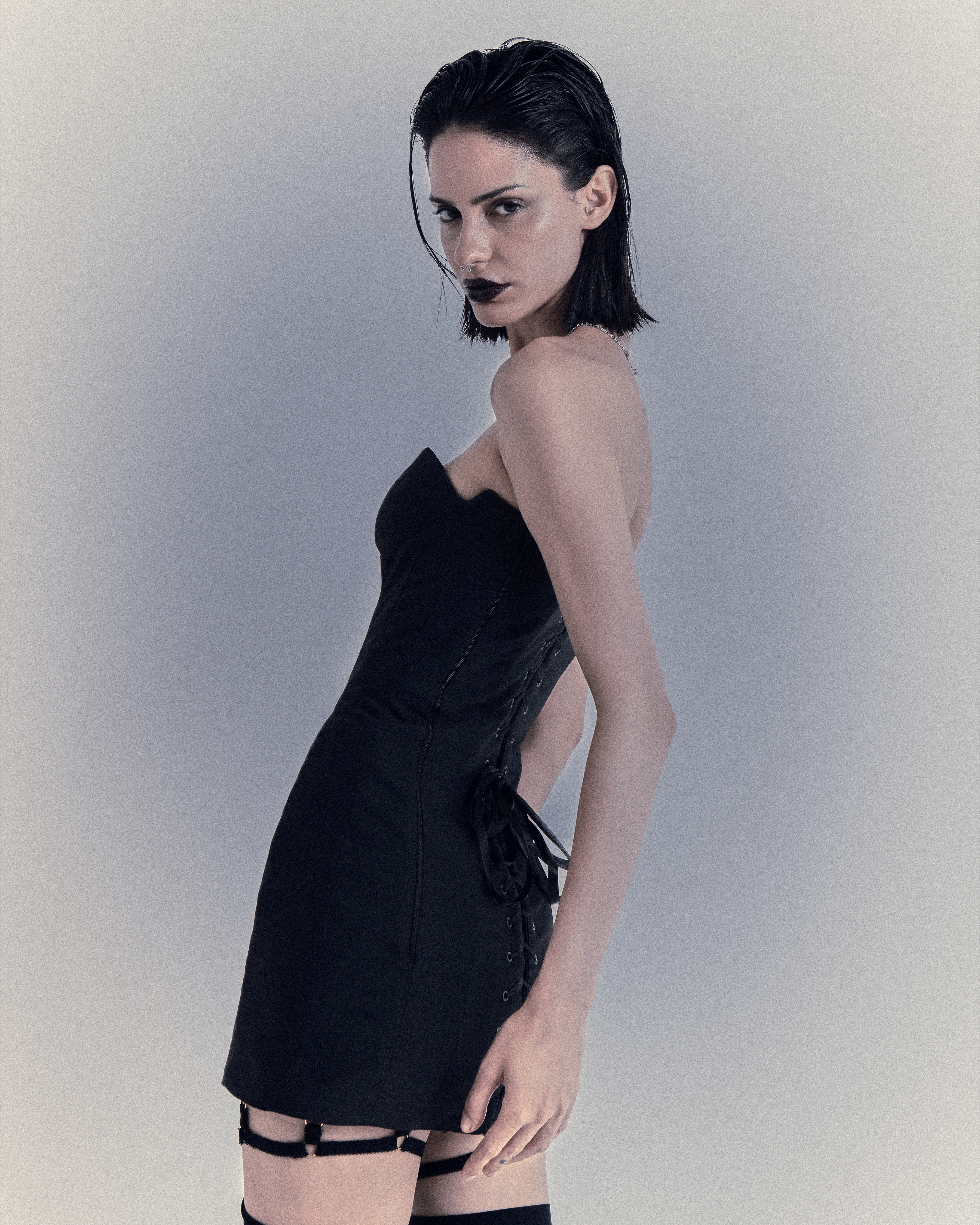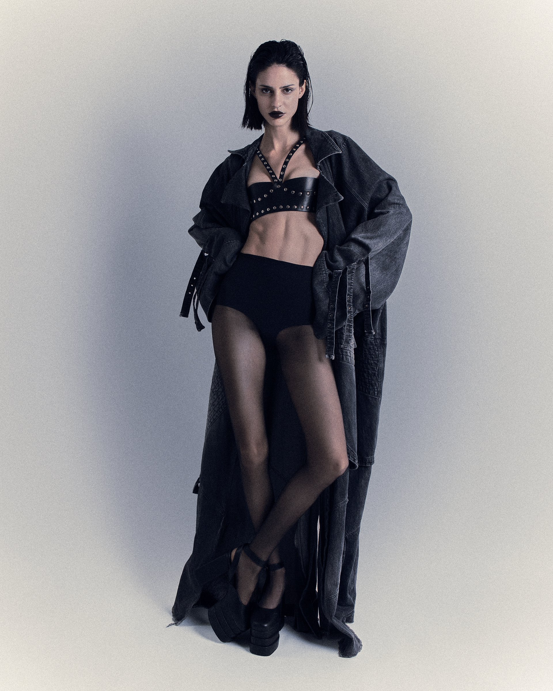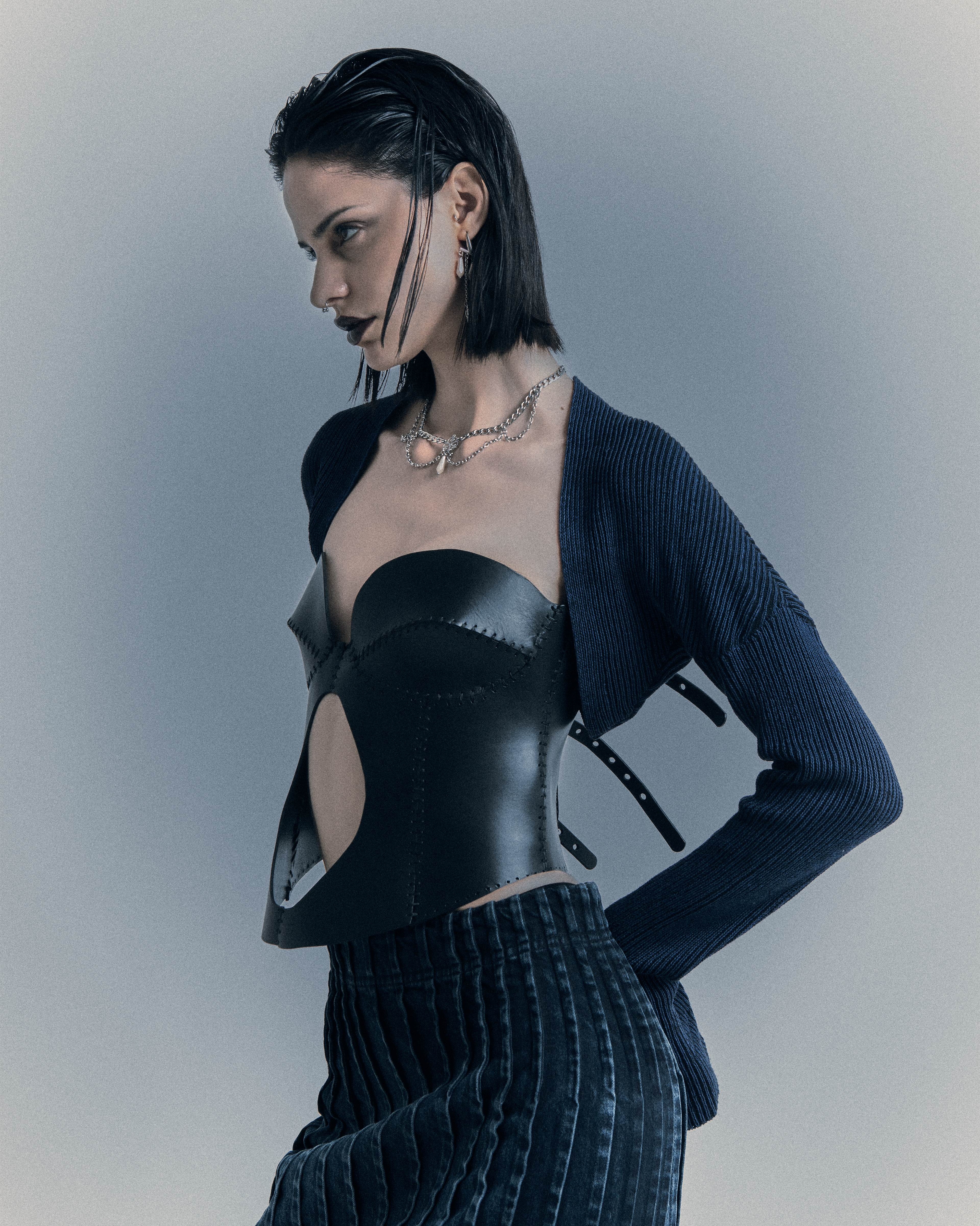 Between corsets, perfect waves, leather gloves and treated denim, she moves in a noir scene where light slices the shadow—and she is part of it.