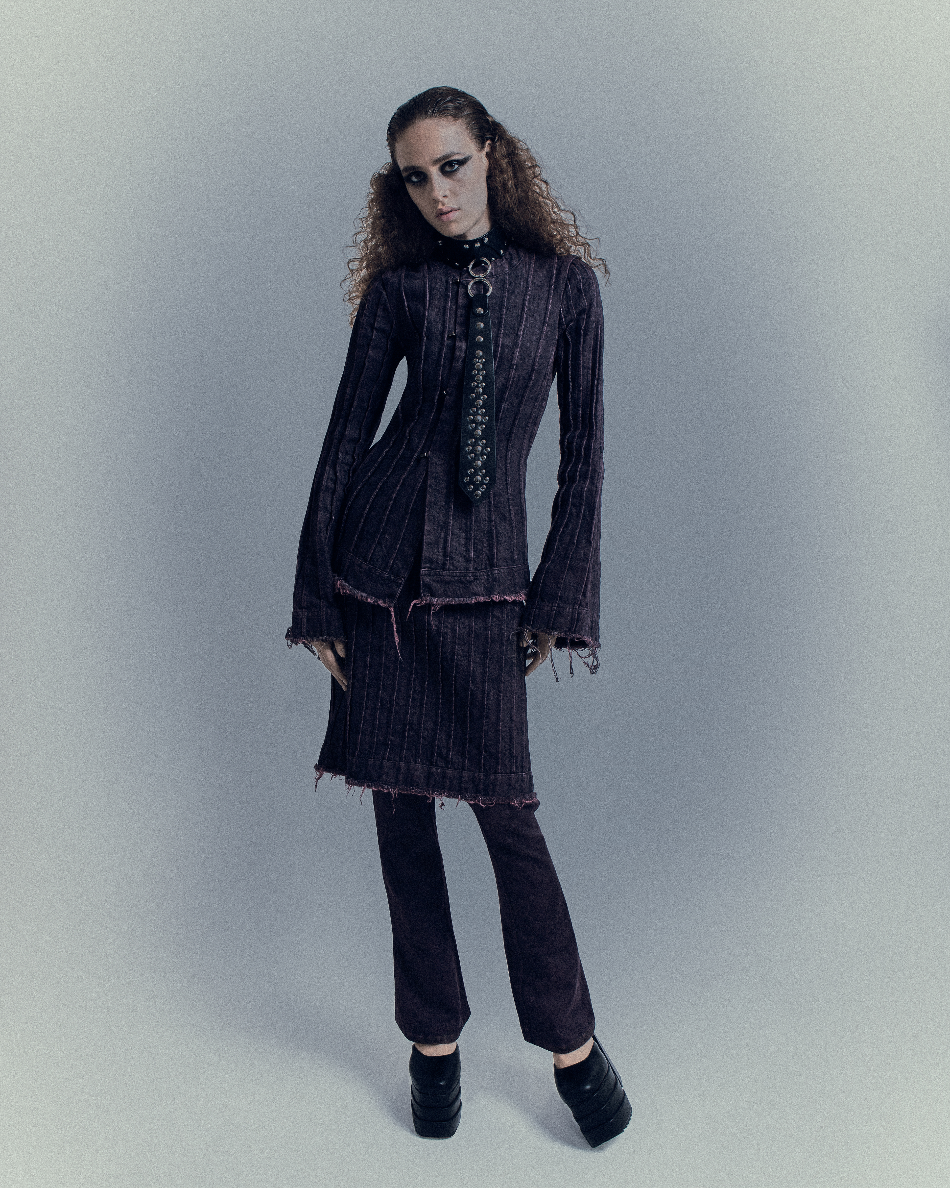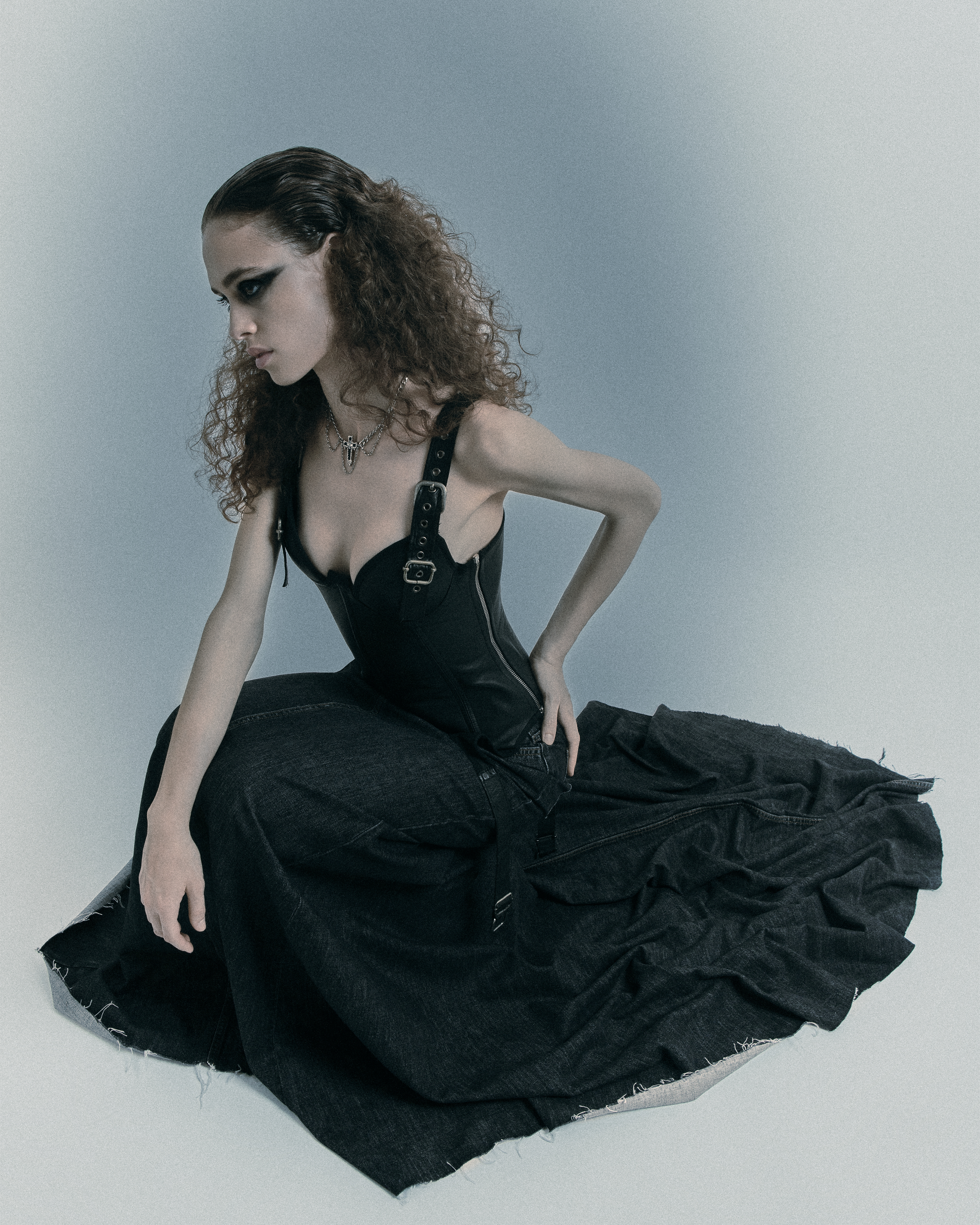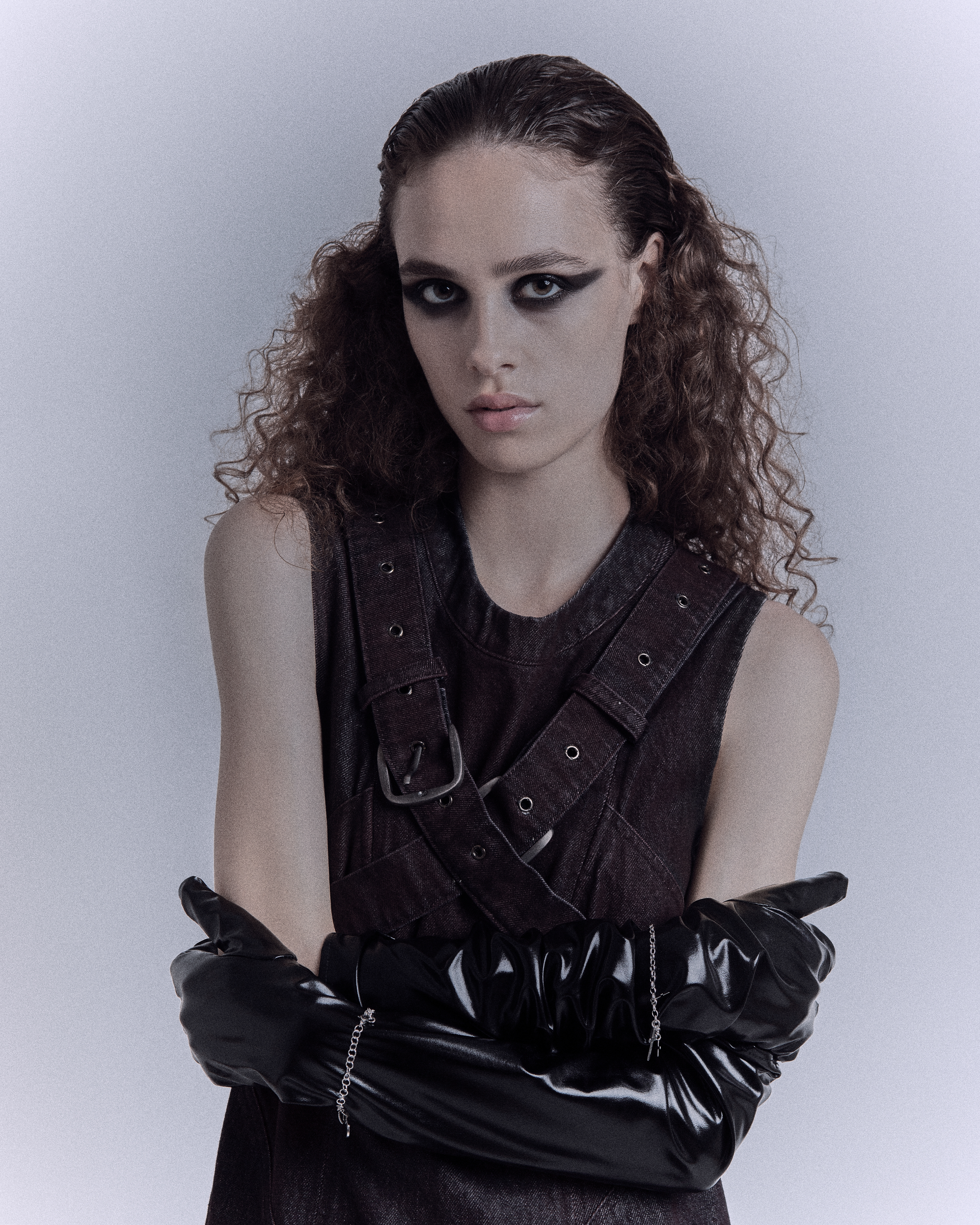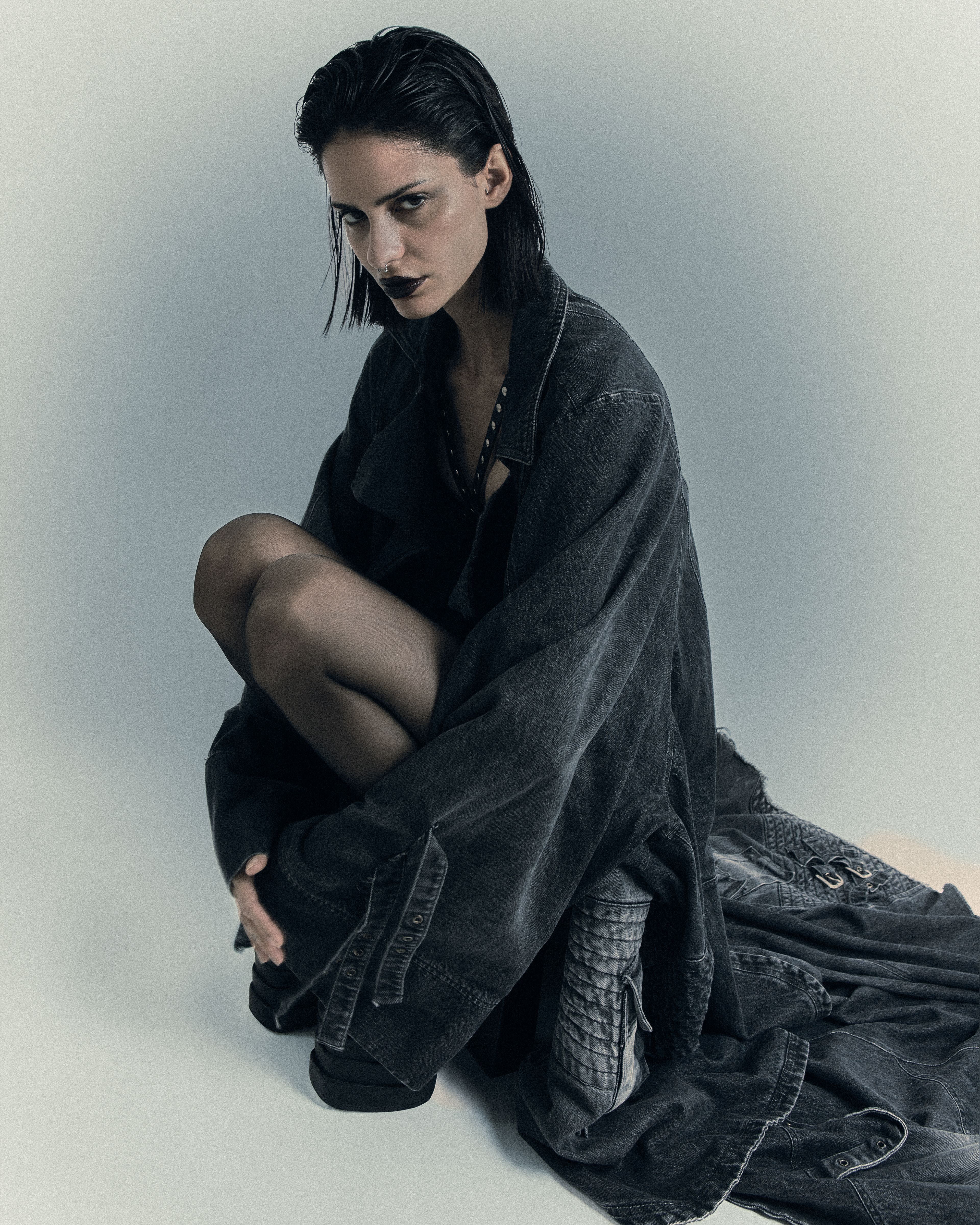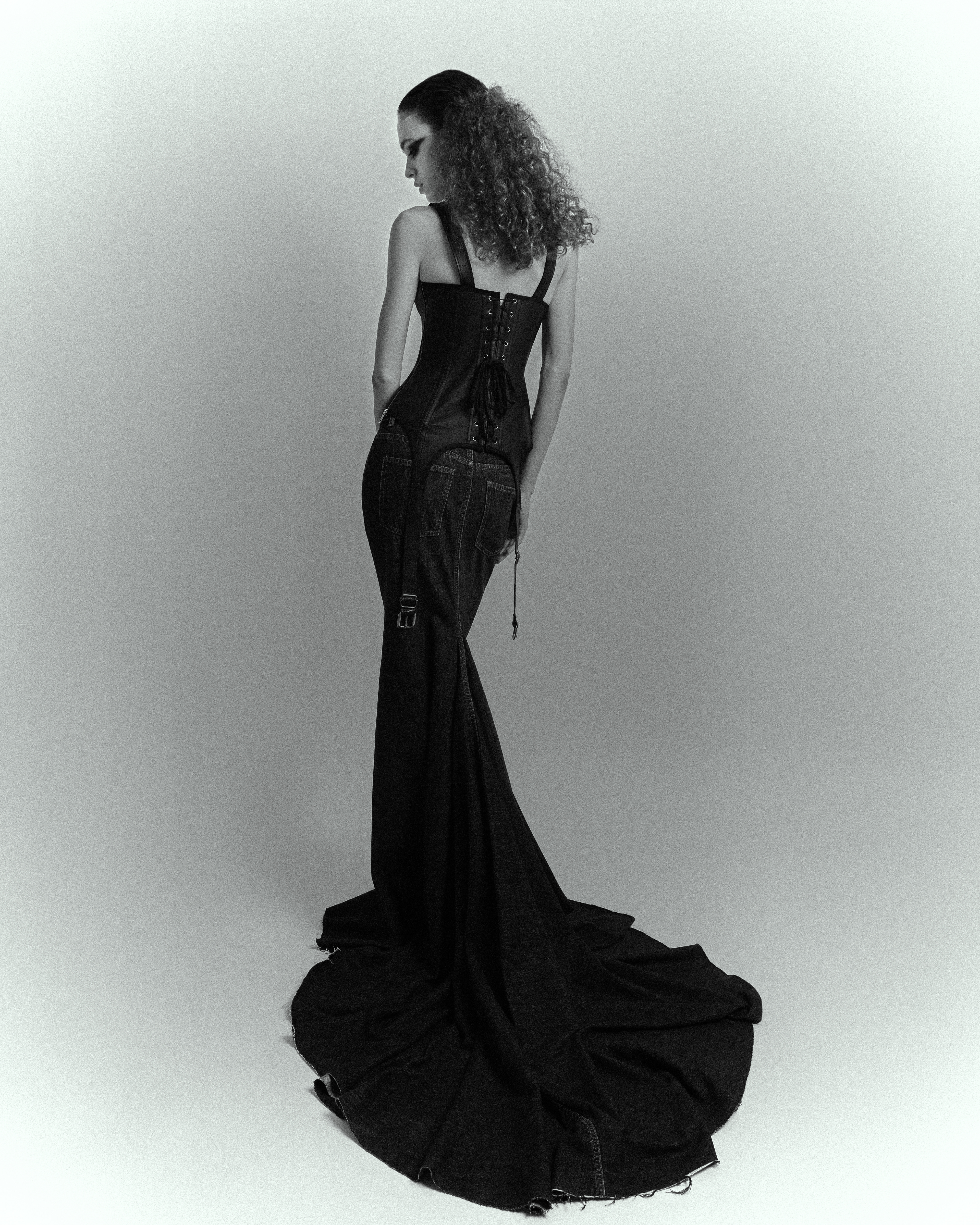 Between corsets, perfect waves, leather gloves and treated denim, she moves in a noir scene where light slices the shadow—and she is part of it.