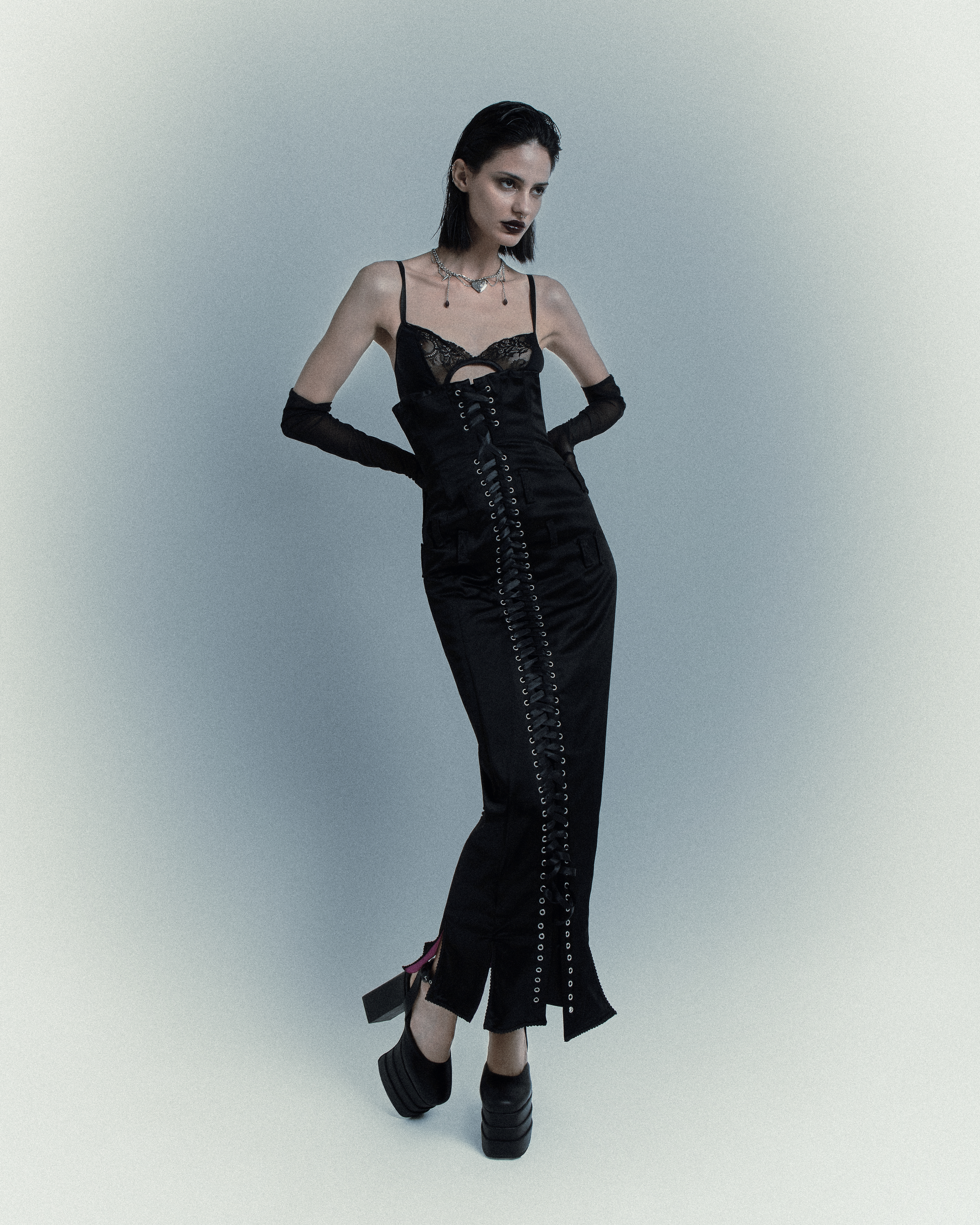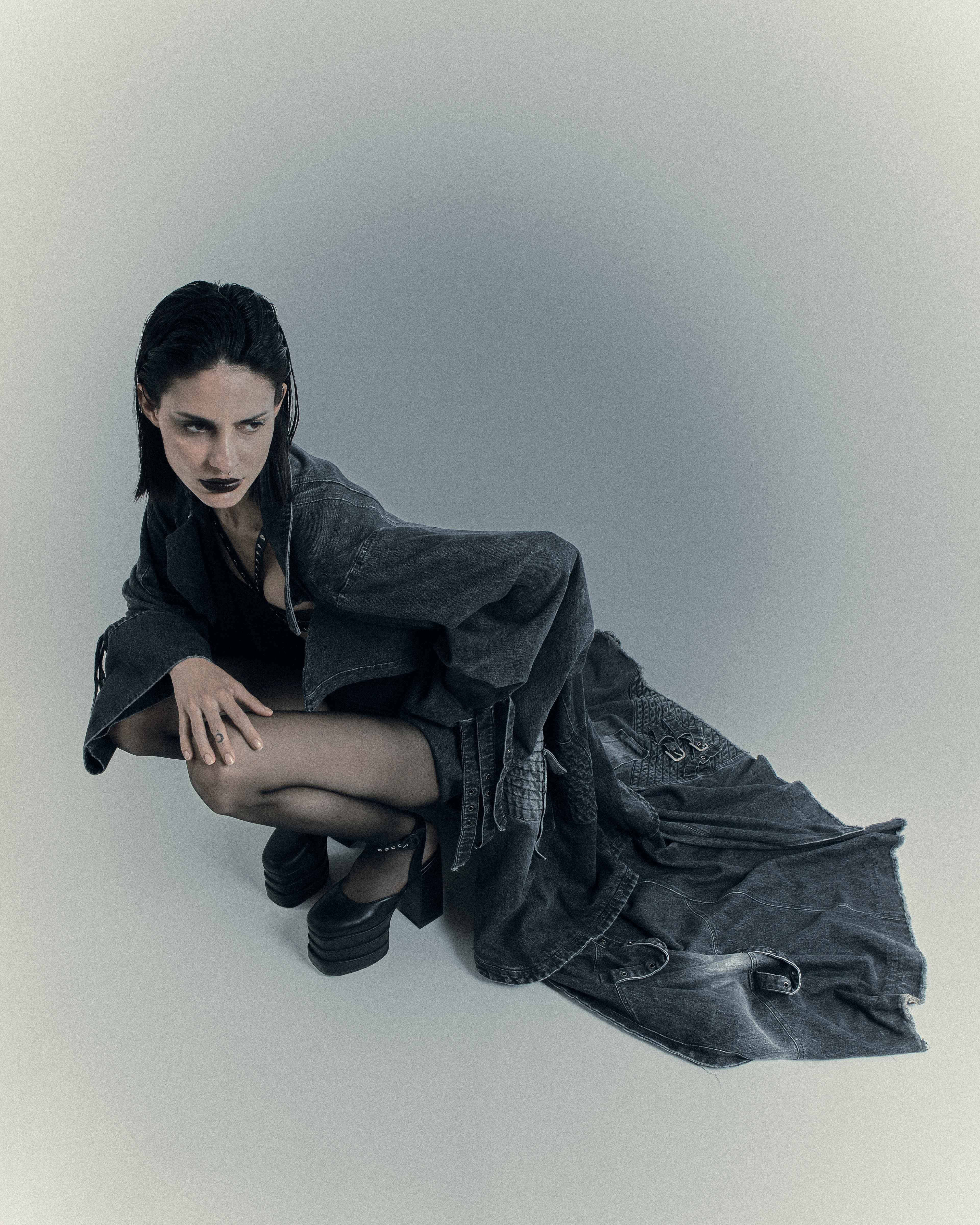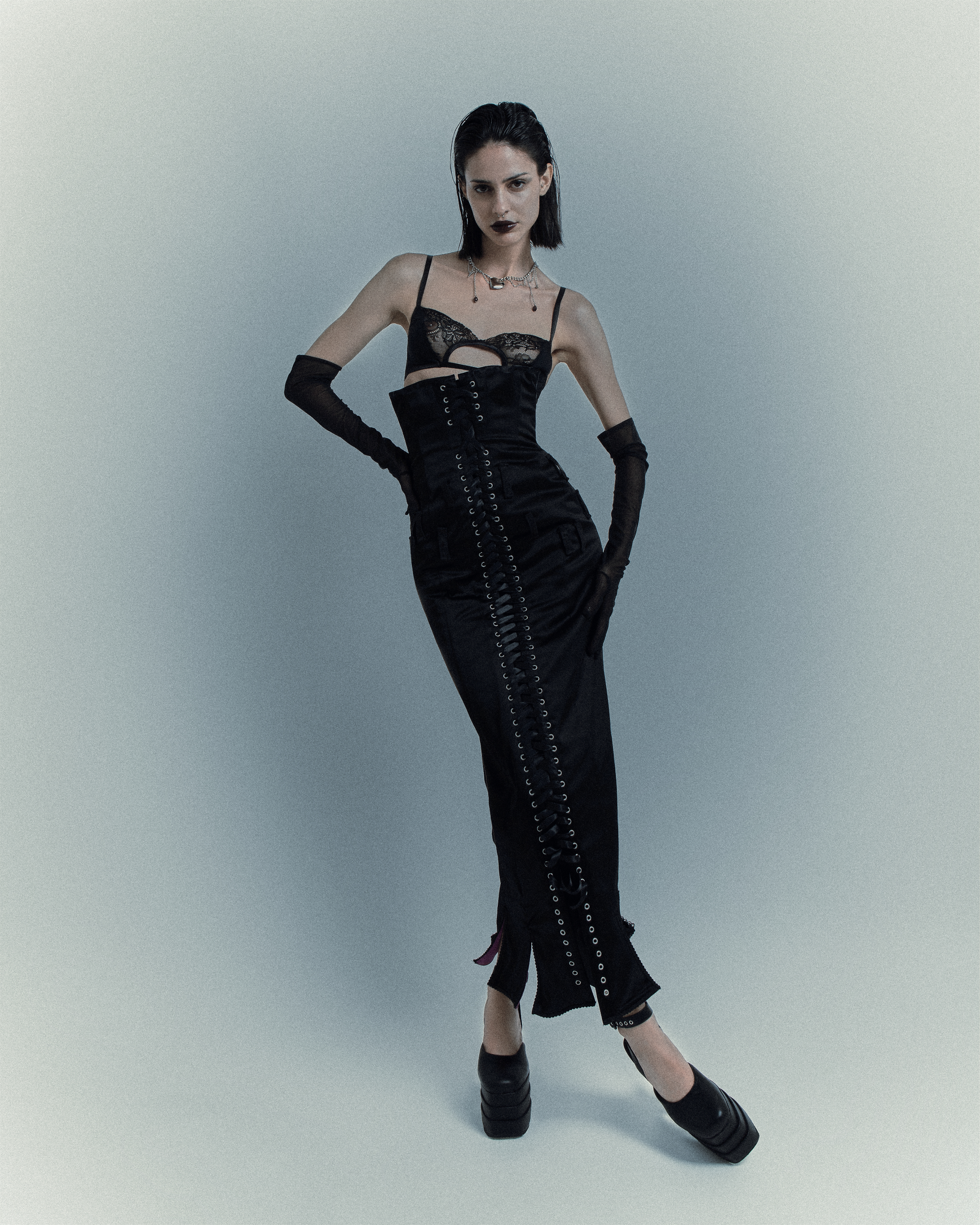 Inspired by the divas of the ’50s yet filtered through a succubus-chic aesthetic, the protagonist is a creature of contrasts: retro yet ultramodern, elegant yet lethal, muse and predator.